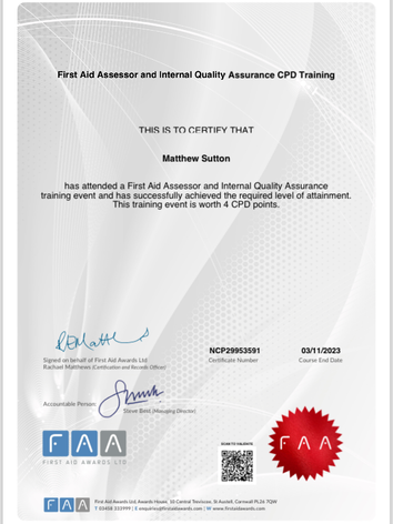 In order to deliver regulated first aid training courses, I had to complete an instructor course, and at the same time I studied for and was awarded a teaching qualification (Level 3 Award in education and training).
